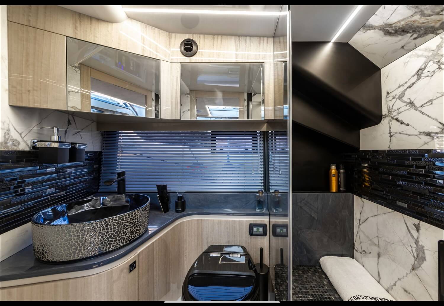 Нижче на гостей чекають повнорозмірний салон із носовою зоною відпочинку. Для ночівлі доступні чотири причали завдяки передній і гостьовій зоні, що трансформується, розташованої в центрі. Власники можуть вибрати між додатковим майданчиком для зберігання в салоні або компактним камбузом, оснащеним плитою, холодильником та раковиною – ідеально підходить для тривалих поїздок. Функціональна ванна кімната має окрему голову та душ з висотою стоячи, все яскраво освітлено завдяки неймовірному, негабаритному вікну.